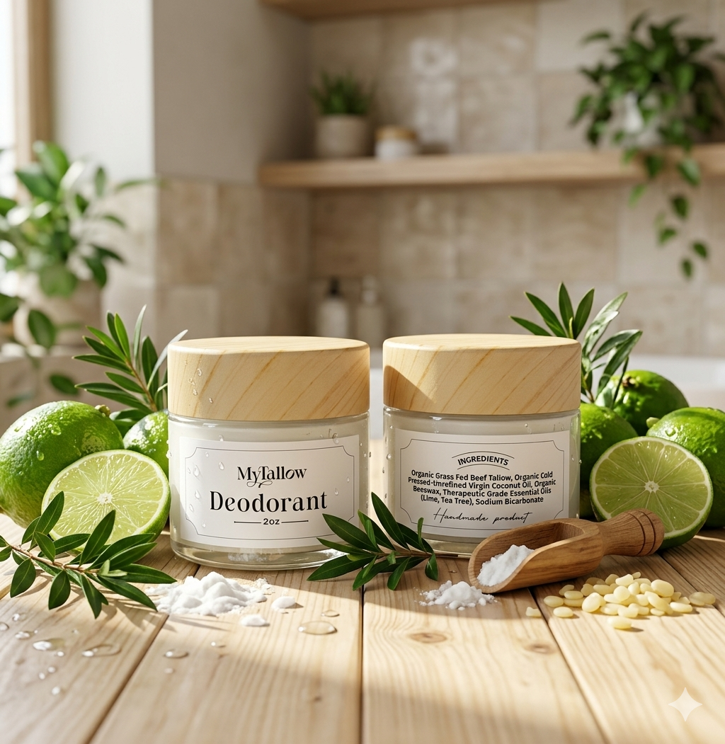 Ingredients: Organic Grass Fed Beef Tallow, Organic Cold Pressed-Unrefined Virgin Coconut Oil, Organic Beeswax, Therapeutic Grade Essential Oils (Lime, Tea Tree), Sodium Bicarbonate.